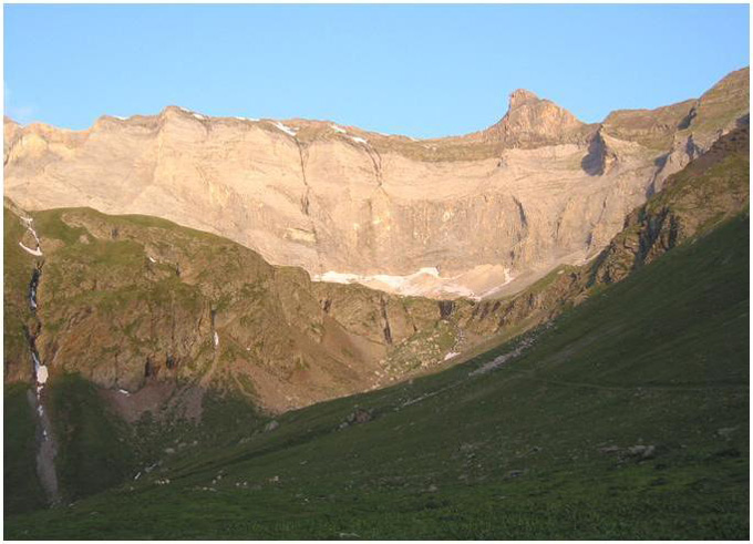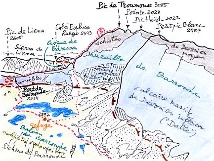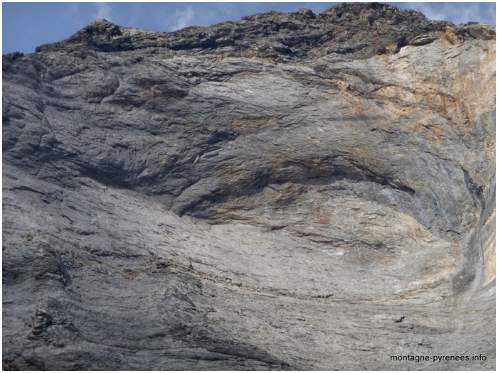 photos consacrée au port de Barroude). Mis à part sa crête de schistes sombres, la muraille est presque entièrement constituée de calcaire clair, massif, du Dévonien inférieur, plus ou moins métamorphisé en marbre. Ce calcaire mérite bien ici le nom de "Dalle" que lui donne les géologues. On retrouve cette "dalle" en bien d'autres endroits des Pyrénées, notamment dans la face nord du Vignemale. Dans la base de la partie sud de la muraille le calcaire est assombri par son mélange avec des "pélites sombres", c'est-à-dire un sédiment argileux métamorphisé proche de l'ampélite. |