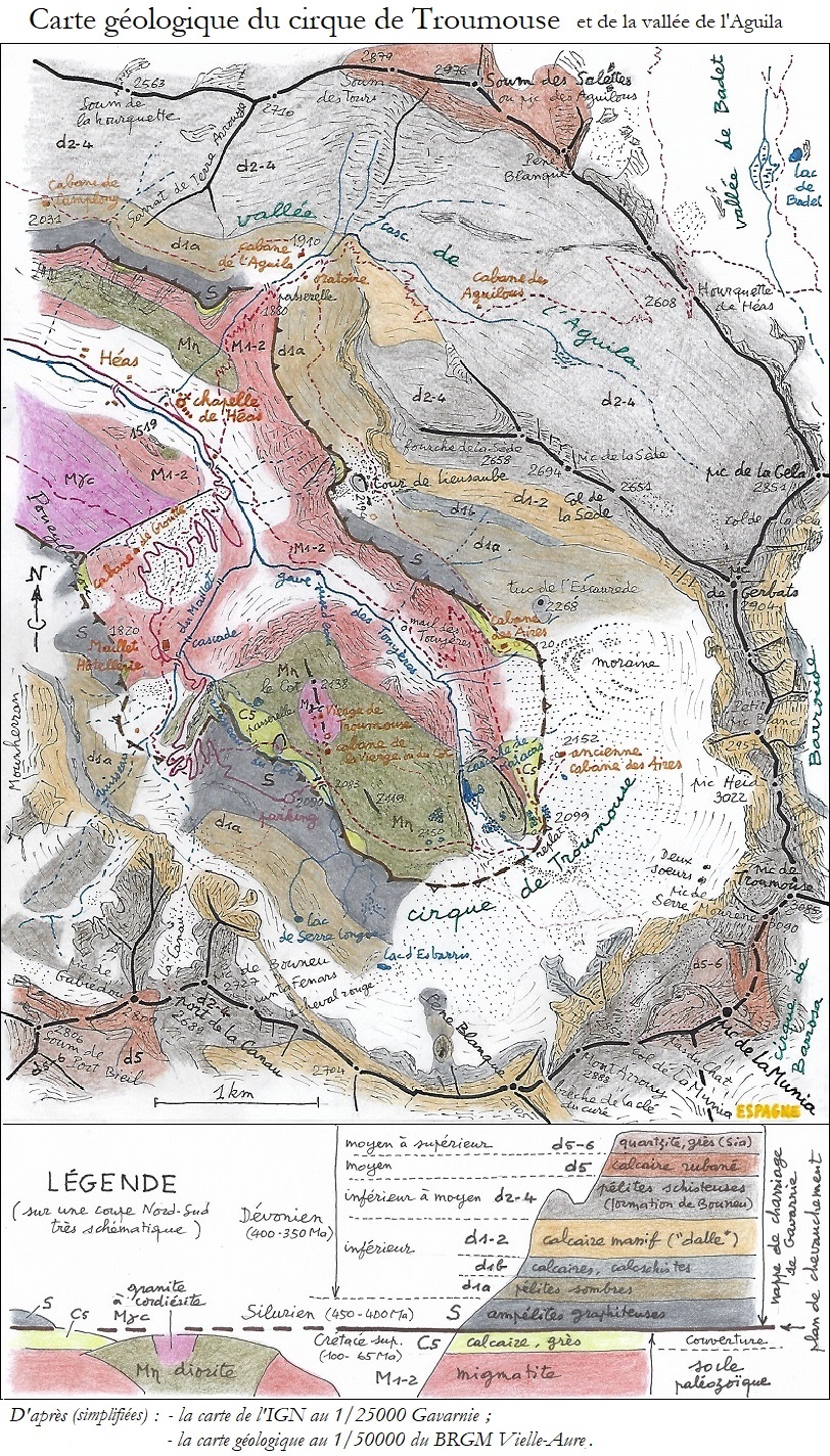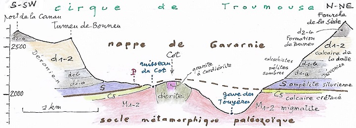 C'est la carte de la "fenêtre" Gavarnie-Héas créée dans la nappe de charriage de Gavarnie par le creusement, par érosion glaciaire, des vallées des gaves de Pau et de Héas. Dans ces vallées elle découvre le socle métamorphique et plutonique sous-jacent. L'extrémité est de cette "fenêtre" (cadre rouge), en amont d'Héas, se situe dans le cirque de Troumouse. Plus à l'est l'érosion glaciaire a creusé les cirques de Barroude et de Barrosa |