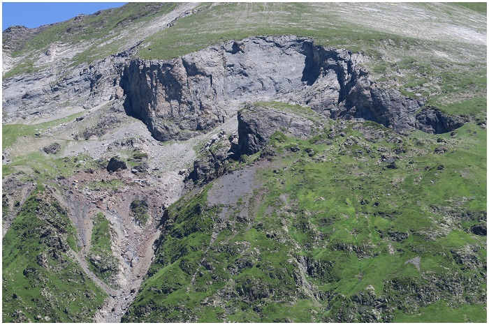 nord, à l'Ouest du pic de la Sède, au pied de la falaise qui