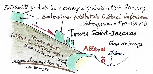 tour se situe un peu au-dessus du plan de chevauchement (trait marron dentelé),
