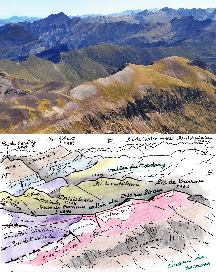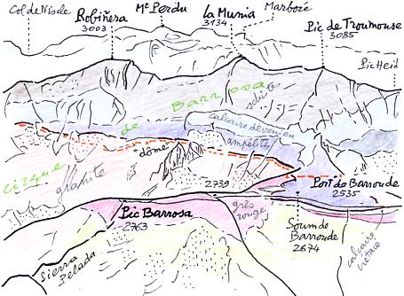 Barrosa, au deuxième plan. Au fond : le massif du Mont-Perdu. On voit surtout son versant nord-est, qui domine la vallée du rio Pinara Le calque explicatif (ci-contre) détaille la topographie et la géologie du pic et du cirque (le tireté orange situe le chemin des mines et le trait gras marron le plan de chevauchement). |