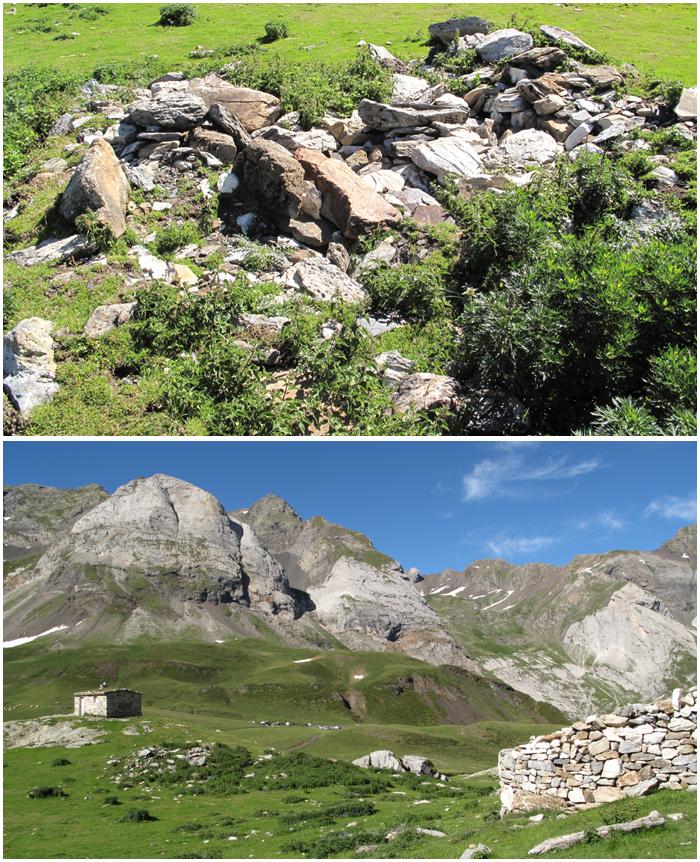 les vestiges de ces deux cabanes réduits à deux tas de cailloux,