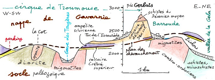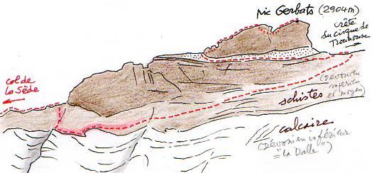 le pic Gerbats, Le trait gras marron figure le plan du chevauchement