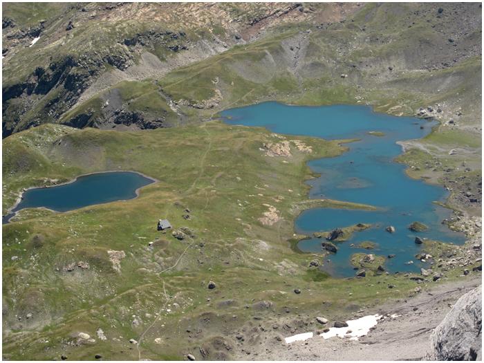 - en bas : Les lacs de la Géla vus du sommet du Gerbats.
