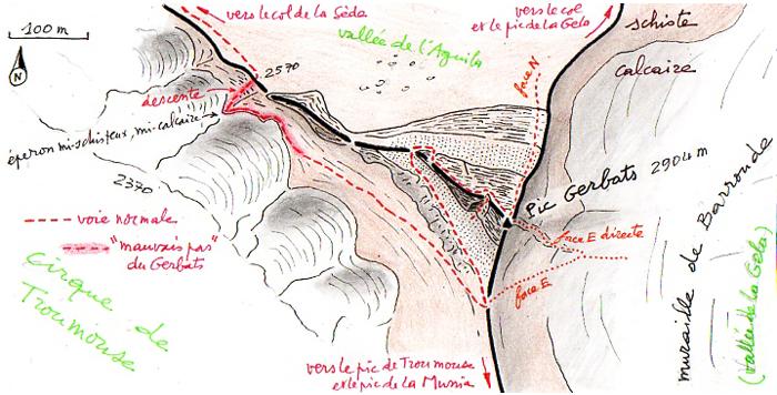 de La Gela et le cirque de Troumouse. C'est ce qu'ont fait les frères Jean et Pierre Ravier et leurs compagnons de cordée, en 1952 par la face est, première des voies qu'ils ont ouvertes dans la muraille de Barroude, puis en 1970 par la face est directe. Mais ce versant est n'est pas accessible au simple randonneur. En revanche il peut monter au pic Gerbats par son versant opposé, celui du cirque de Troumouse, en empruntant la voie normale, peu difficile quoique obligeant à franchir le célèbre "mauvais pas du Gerbats" (note 4) et comportant un peu d'escalade facile dans sa partie terminale. |