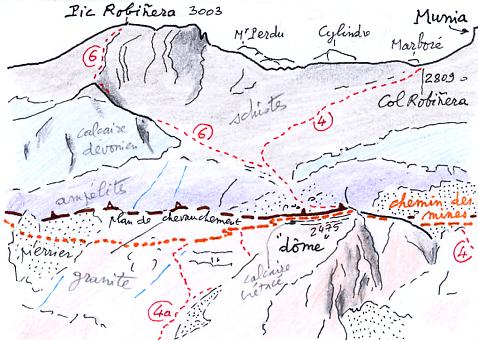en novembre des abords du pic Barrosa. En tirets rouges sur le calque, les différents itinéraires permettant de gravir facilement le pic Robiñera et le pic de La Munia depuis le fond du cirque. Par dessus le col de Robiñera, on aperçoit