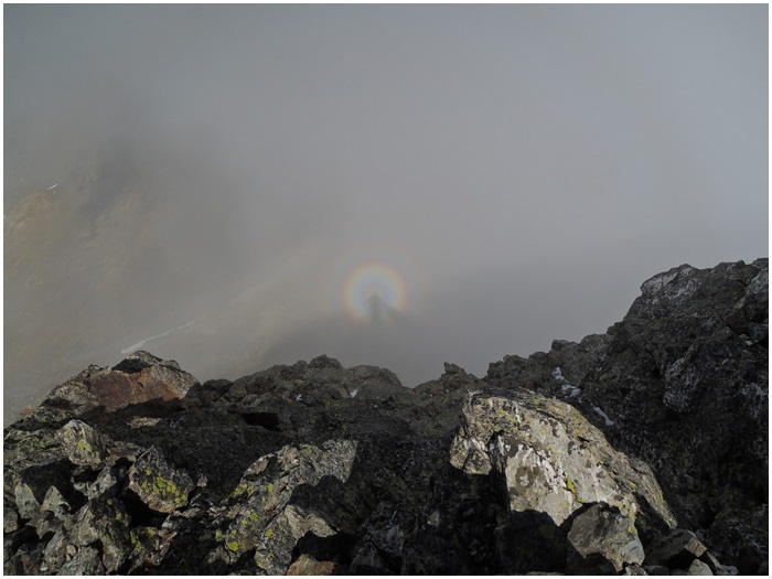 au sommet du pic. A l'arrière-plan, à gauche, la brume