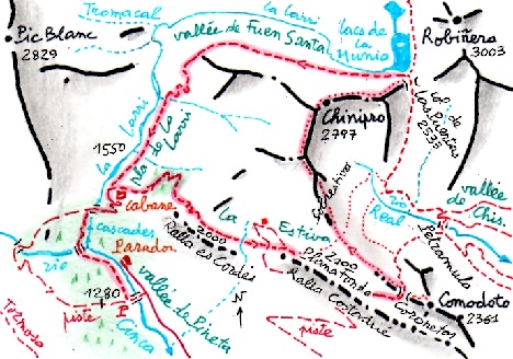 ouest des pâturages de La Estiva, au-dessus de la forêt) et