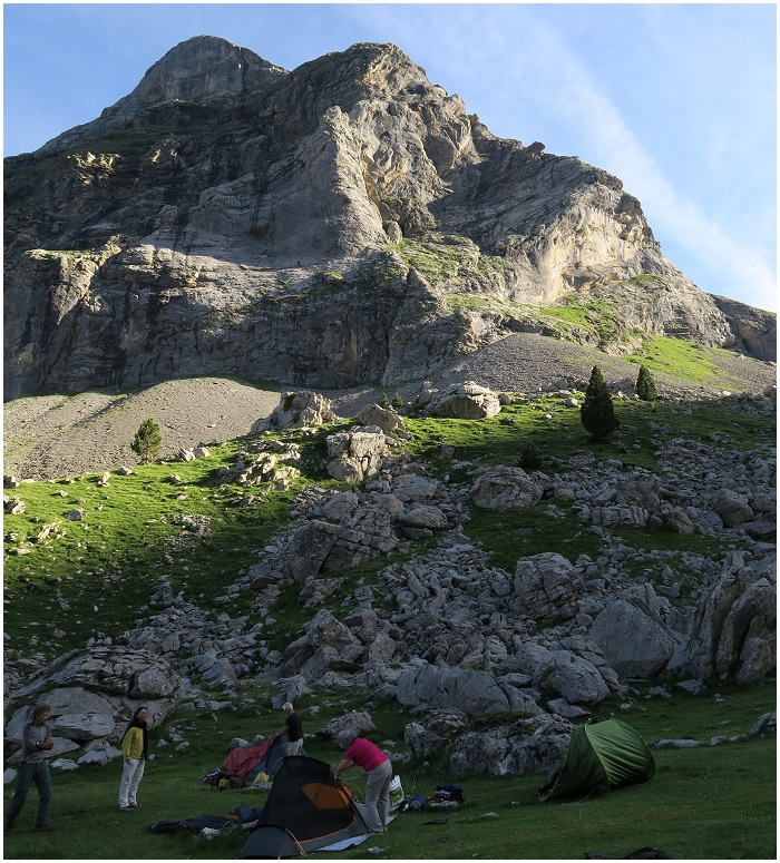 piste sur la rive gauche du torrent. Sur la rive droite, accessible par une passerelle, on trouve aussi, un peu en amont, des surfaces herbeuses planes, entre des blocs rocheux, où il est possible de camper, la nuit. |