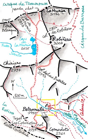 par l'ouest le pic Chinipro, débouche dans le pla de La Larri, vallée