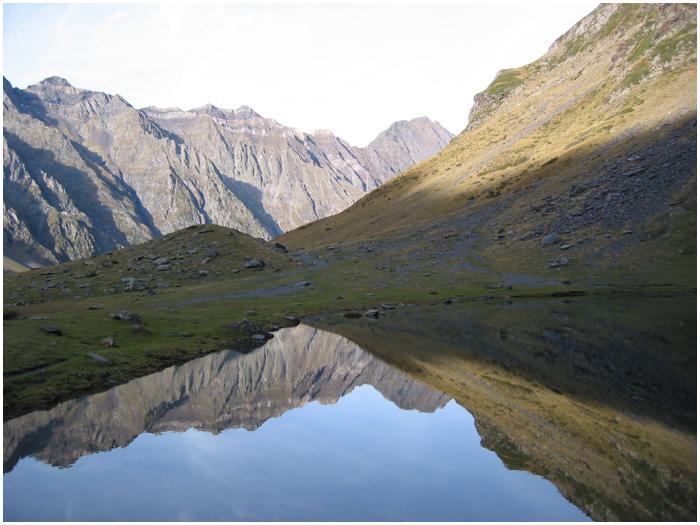 falaise, se reflètent, de gauche à droite, le pic d'Estaragne,