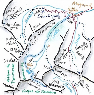 (en bleu) depuis le sommet du pic de Barrosa, sur la cabane de Barrosa