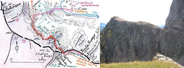 de Parzan ; Dénivelé : 1200 m pour le pic Liena ; compter en plus environ 6 ou 7 km de parcours plus ou moins horizontal et 300 m de dénivelé de plus pour aller jusqu'au port de Barroude ; Intérêt : tout est réuni pour faire de ce circuit une course exceptionnelle : ascension par un ancien et pittoresque chemin muletier, visite d'une ancienne exploitation minière, survol d'un vaste plateau pastoral sur la crête d'une sierra face au Mont-Perdu, spectaculaire parcours de corniches vertigineuses, dans l'historique "chemin des mines" traversant le cirque de Barrosa, facile lecture de la géologie du versant sud des Pyrénées, retour par une belle vallée boisée ; Période : fin juillet, août et septembre de préférence, quand il n'y a plus de neige sur les corniches ; Difficulté : modérée, mais attention : cette course, longue (compter environ 10 heures), emprunte dans la traversée du cirque des vires trés aériennes et implique la traversée d'éboulis pentus et croulants au-dessus d'à-pics, pas toujours sécurisée par des mains courantes ; elle nécessite donc un bon entrainement physique, l'absence d'appréhension au-dessus du vide, un pied sûr et beaucoup d'attention ; une corde peut être utile dans certains passages (des spits sont en place) ; la présence de neige (la corniche sud ayant une orientation nord elle peut y persister longtemps dans les couloirs encaissés), rend la course plus difficile : un bon équipement (piolet, crampons, et éventuellement corde) est alors indispensable pour la traversée de névés pentus ; la présence de glace peut rendre la traversée du cirque impossible ; se renseigner sur l'état du chemin des mines auprès des gardiens du refuge de Barroude ; Topos : aucun connu sur papier (avant 2014 : note 5), mais on peut consulter au moins un site internet, celui de Philippe Queinnec , qui, en septembre 2004, a réalisé la " somptueuse " combinaison d'itinéraires au départ de l'Hôpital de Parzan : port de Barroude, pic de Troumouse, pic de Serre Mourène, Munia, cirque, vire de la falaise sud, pic Liena, descente directe sur l'Hôpital de Parzan. En 2011, venant de la vallée de La Gela, il a parcouru à nouveau le chemin des mines,aller et retour. |
