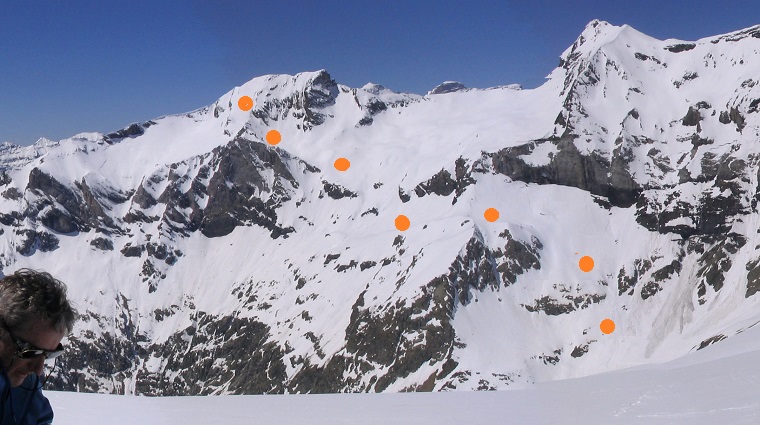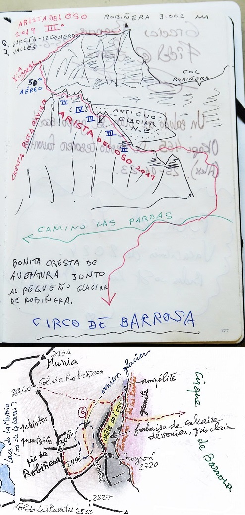 A l'est du pic de Robiñera pointe un rognon rocheux (une antécime, surmontant une grande face de calcaire dévonien clair). Il est séparé du versant est du pic par un collet, au-dessus d'un vallon neigeux, bien visible du"dôme" : c'est par ce collet que passe l'itinéraire : voir la page de PHOTOS de la face est (vignette ci-dessous) où figure une photo avec calque explicatif indiquant l'itinéraire. Celui-ci est également parfaitement visible dans un vaste panorama pris du sommet de La Munia, signé Olivier Guix, pour lequel vous trouverez un lien dans la page La Munia.