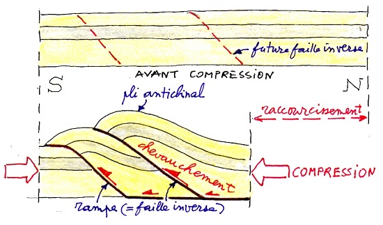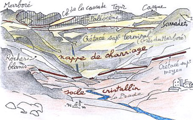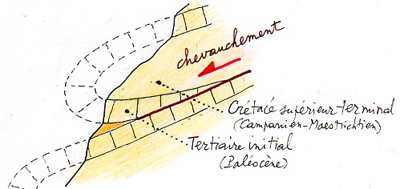 (proche du chemin de la Mature). Le SCHEMA ci-contre, très simplifié, vise à expliquer ce processus de chevauchement, qui peut se produire à toutes les époques, lors de la surrection des montagnes par collision continentale (en particulier celle des Pyrénées), et à toutes les échelles. |