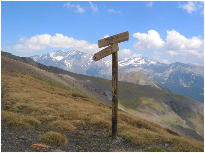 des éboulis, porte la pancarte marquant le port(2527 m.), un peu au-dessus