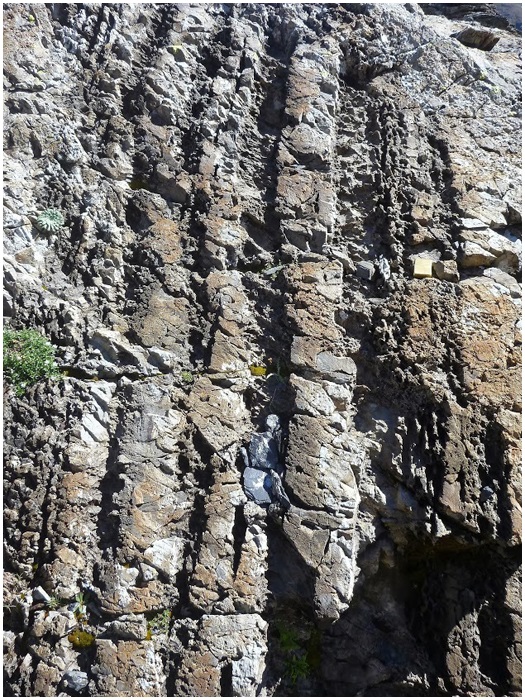 par la falaise nord dont les couches colorées (ampélite