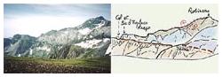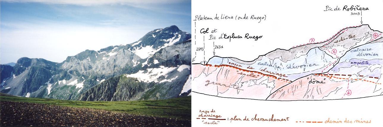 (le tireté orange figure le chemin des mines, et le trait marron le plan de chevauchement)
